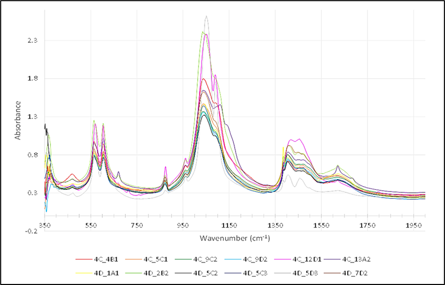 The bones across the deposit vary between shades of yellow, brown and white, but some are black and grey, showing they have been burnt. Preliminary tests on these burnt bones used infrared spectrometry to analyse how they were burnt. This technique uses a laser to analyse the molecular structure of the bone, and the spectrum it produces can indicate how this structure has been modified from its original state. Results suggest that several bones were burnt after the meat was removed and in relatively low temperature fires (less than 400°C). This could have been because heat from hearths in the shelter was affecting bones buried beneath them and/or small fires were used to dispose of bones when cleaning the shelter. It is unlikely that these burnt bones were from cooking.
